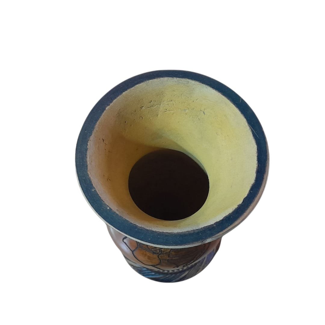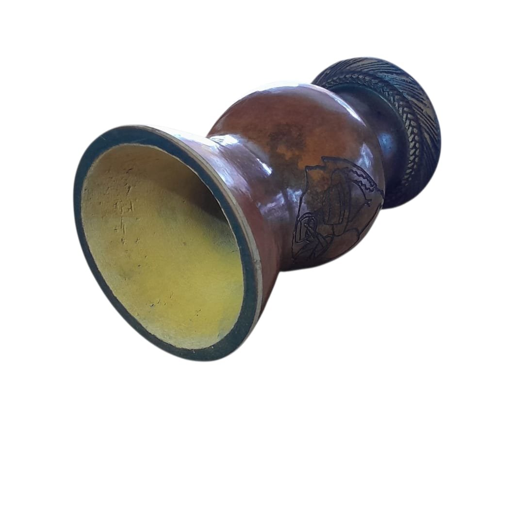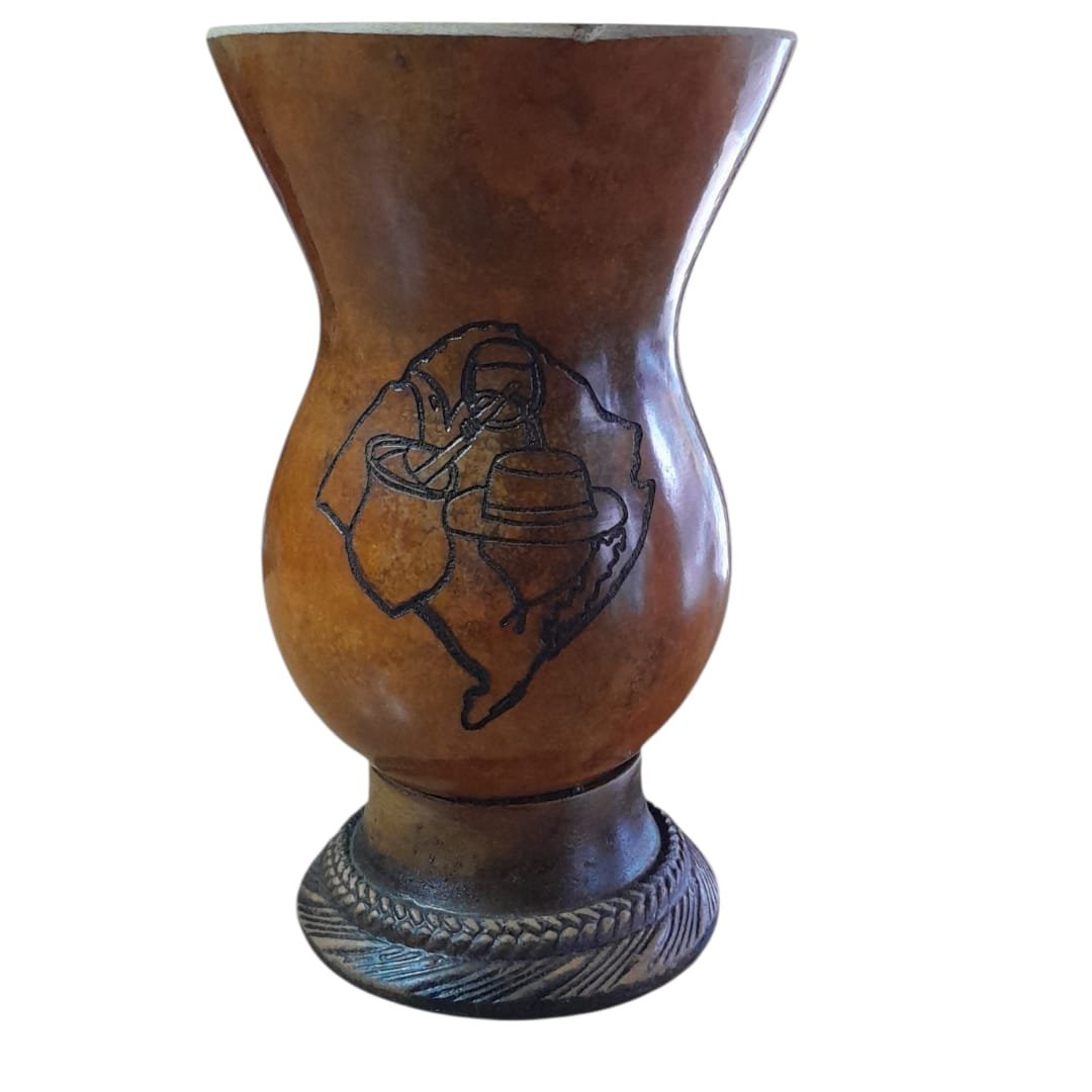 Cuia de porongo pqueno, sem bocal, com pé, motivo gaúcho mapa c/ chimarrão, chaleira e chapéu.
